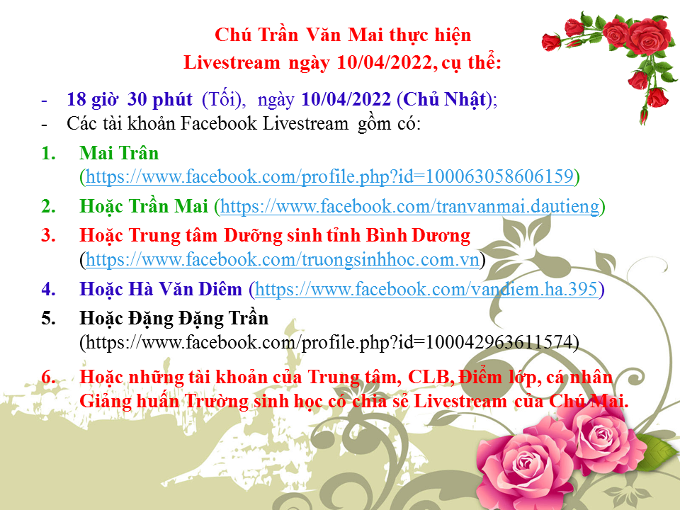 🎀 Thông tin: Chú Trần Văn Mai sẽ Livestream lúc 18 giờ 30 phút ngày 04/09/2022 (Chủ Nhật).